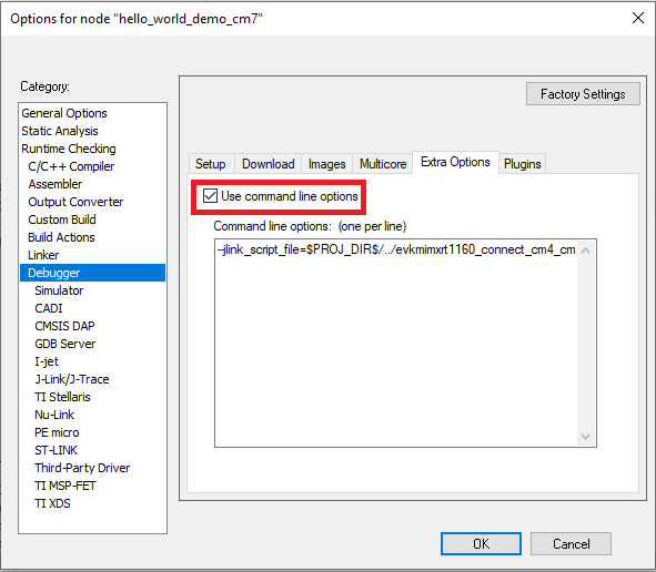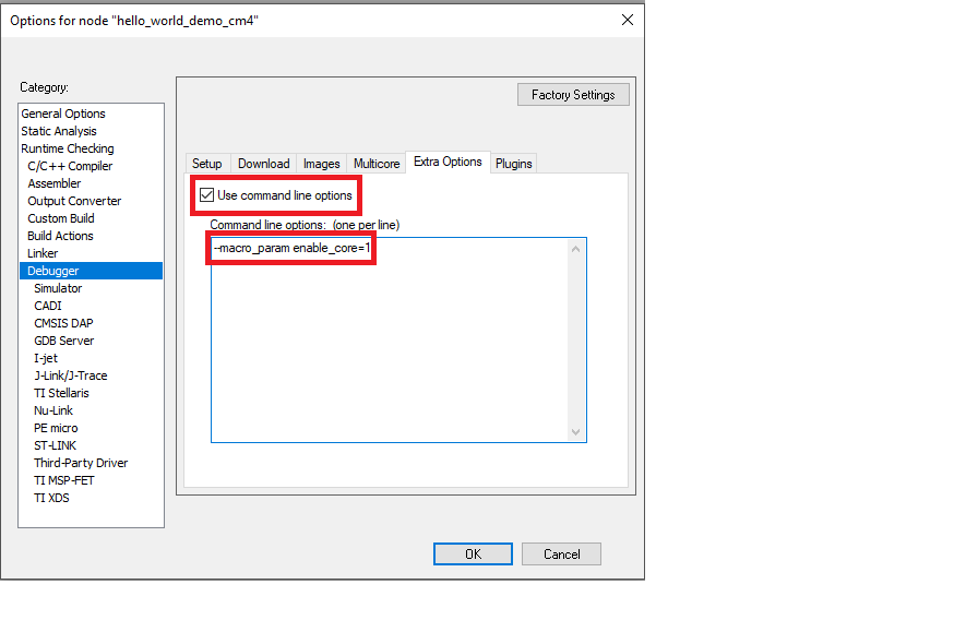 • When using CMSIS-DAP to debug cm4 project on IAR, an extra option needs to be specified in debugger settings. Check and fill in –macro_param enable_core=1 in Debugger -> Extra Options -> Command line options, as shown in Figure 3.