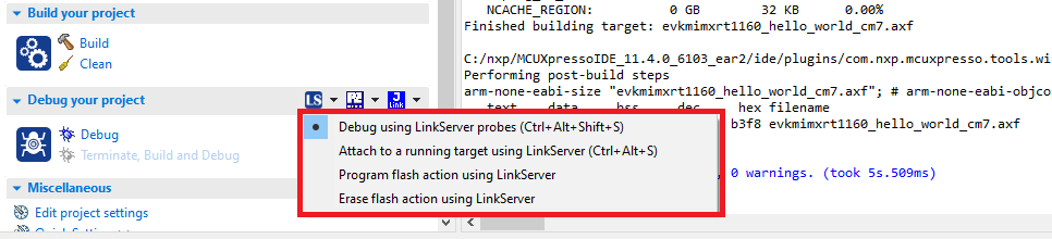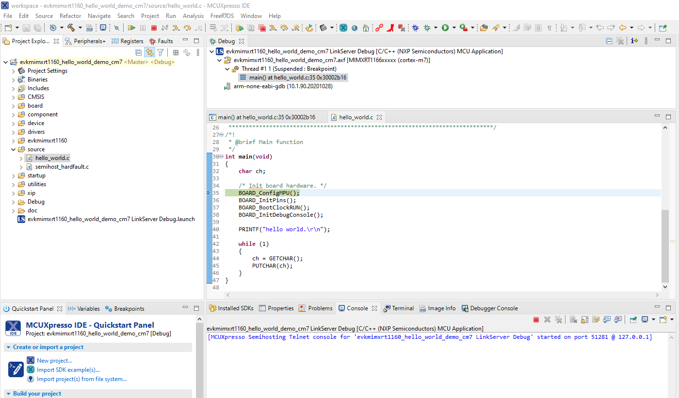 This section describes the steps required to configure MCUXpresso IDE to build, run, and debug example applications. The hello_world demo application targeted for the MIMXRT1160-EVK hardware platform is used as an example, though these steps can be applied to any example application in the MCUXpresso SDK.