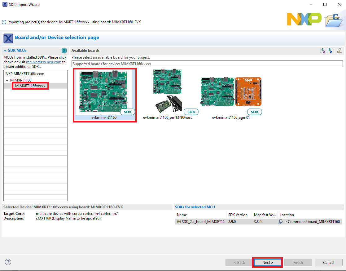 3. In the window that appears, select MIMXRT1166xxxxx. Then, select evkmimxrt1160 and click Next.