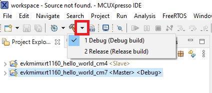 3. Now, two projects should be imported into the workspace. To start building the multicore application, highlight the hello_world_cm7 project (multicore master project) in the Project Explorer. Then choose the appropriate build target, Debug or Release, by clicking the downward facing arrow next to the hammer icon, as shown in Figure 3. For this example, select Debug.