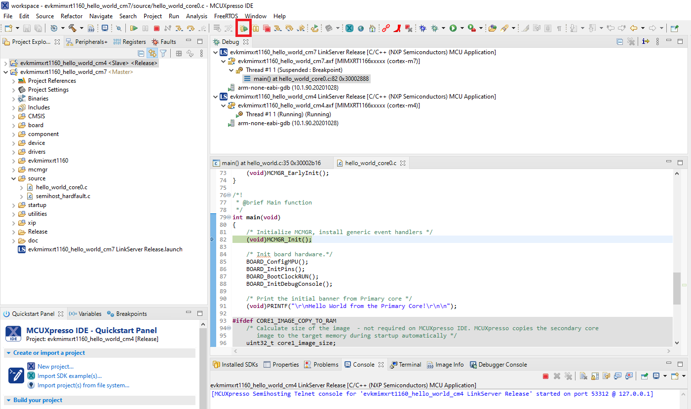 This section describes the steps required to configure MCUXpresso IDE to build, run, and debug multicore example applications. The following steps can be applied to any multicore example application in the MCUXpresso SDK. Here, the dual-core version of hello_world example application targeted for the evkmimxrt1160 hardware platform is used as an example.