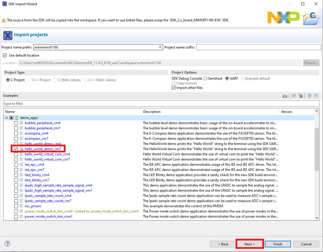 4. Expand the demo_apps folder and select hello_world. Then, click Next.