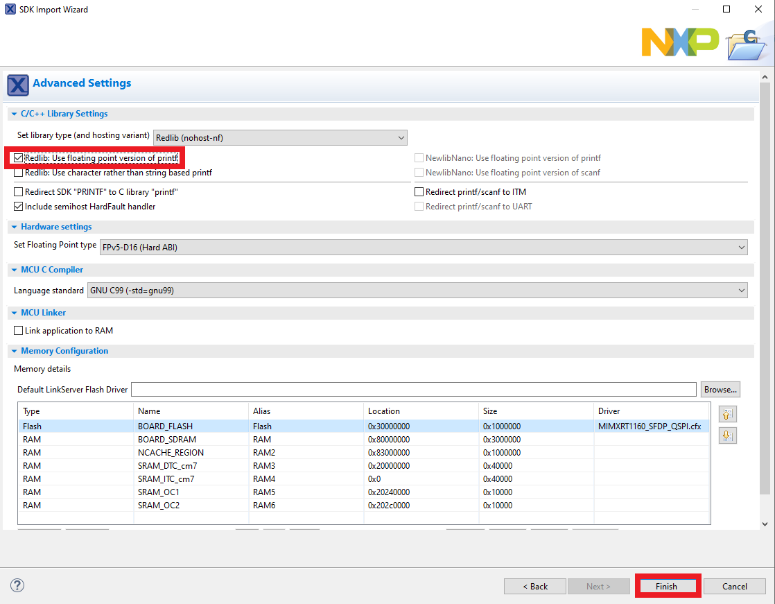 5. Ensure Redlib: Use floating point version of printf is selected if the example prints floating point numbers on the terminal for demo applications such as adc_basic, adc_burst, adc_dma, and adc_interrupt. Otherwise, it is not necessary to select this option. Then, click Finish.