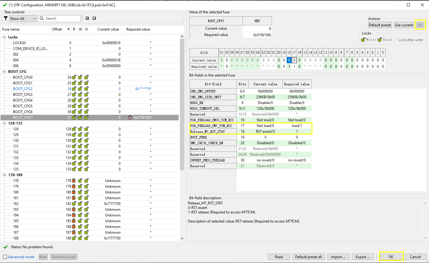For ROM to successful copy image from flash to CM7 TCM. CM7 TCM ECC should be pre-configured. To archive this, a Fuse need to be set. Click OTP configuration, set