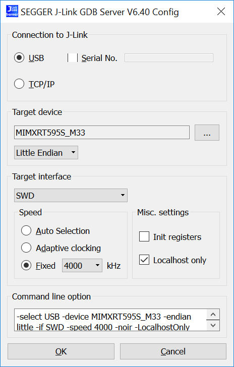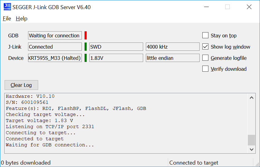 Open the J-Link GDB Server application. Assuming the J-Link software is installed, the application can be launched by going to the Windows operating system Start menu and selecting Programs->SEGGER->J-Link <version> J-Link GDB Server.