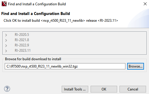 • Download the DSP Configuration V10.1.11 for your operating system. This is installed later through the IDE. For details, see Install RT500 DSP Build Configuration.