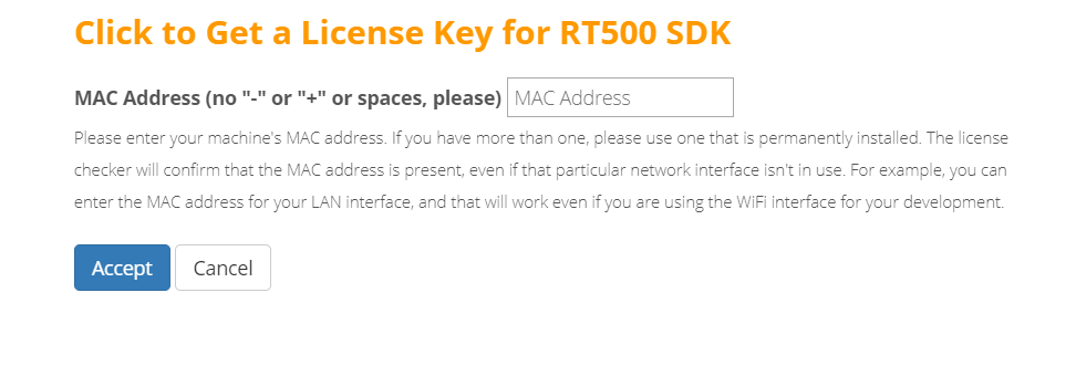 1. Click the CLICK TO GET A LICESNE KEY FOR RT500 SDK button.
