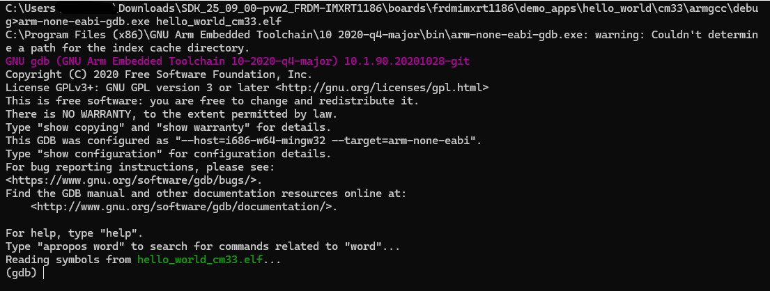 arm-none-eabi-gdb.exe <application_name>.elf. For this example, it isarm-none-eabi-gdb.exe hello_world.elf.