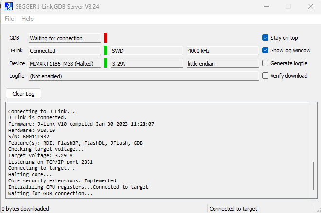 JLinkGDBServer.exe -device MIMXRT1186_M33 -if SWD -speed 4000 -jlinkscriptfile <frdmimxrt1186_cm33.jlinkscript> -stayontop -ir