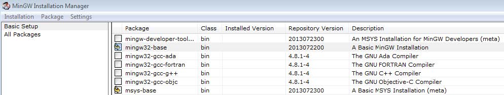 Ensure that the mingw32-base and msys-base are selected under Basic Setup.