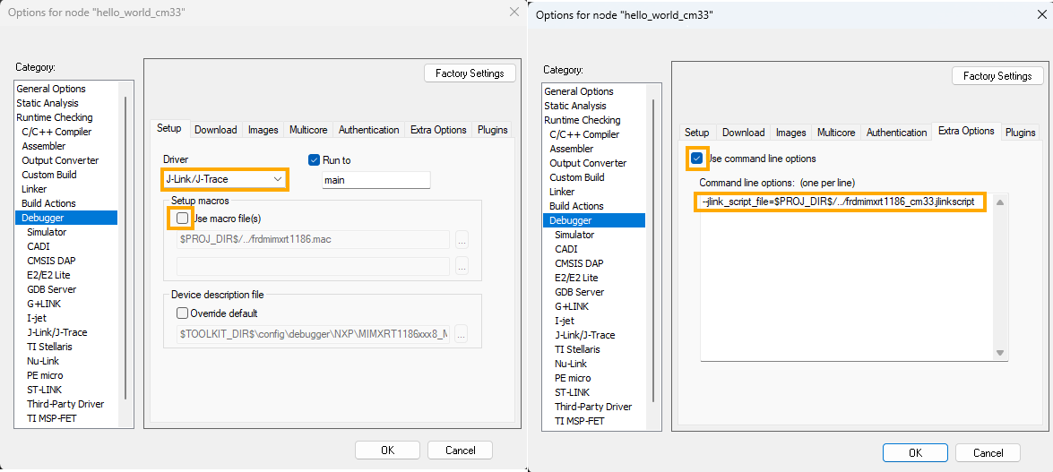 Both CMSIS-DAP and J-Link debugging interfaces are supported for IAR IDE. Though not mandatory, it is recommended to reset board for each download/debug.
