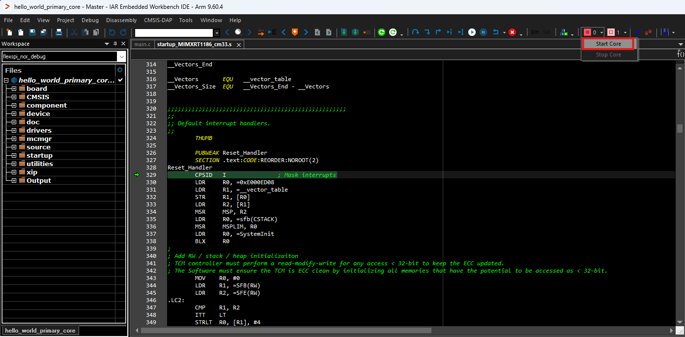 Begin with a simple dual-core version of the Hello World application. The multicore Hello World IAR workspaces are available in the folder: