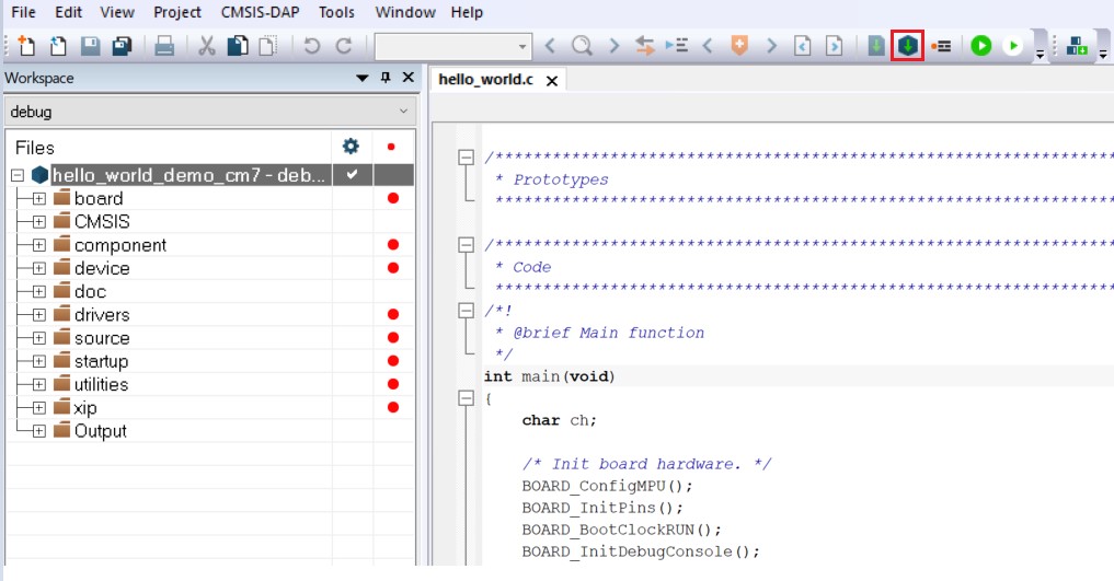 • flexspi_nor_hyperram_debug – Project configuration is same as the debug target. The linker file is flexspi_nor_hyperram linker, where text is put in flash and data put in HYPERRAM. For this example, select hello_world_demodebug.