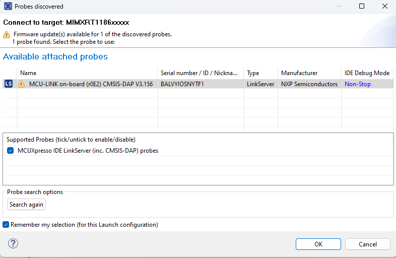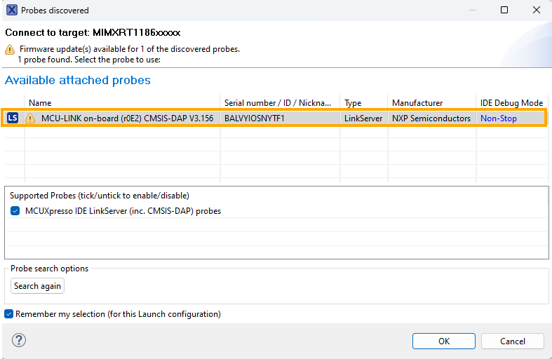 J60[1..3]on001. In the worst case when MCUX IDE cannot erase the flash, use the secure provisioning tool. For more information, see Use Secure Provisiong Tool to erase flash.The first time you debug a project, the Debug Emulator Selection dialog is displayed, showing all supported probes that are attached to your computer. Select the probe through which you want to debug and click OK. Here we assume that you are using a CMSIS-DAP debug interface. (For any future debug sessions, the stored probe selection is automatically used, unless the probe cannot be found.)