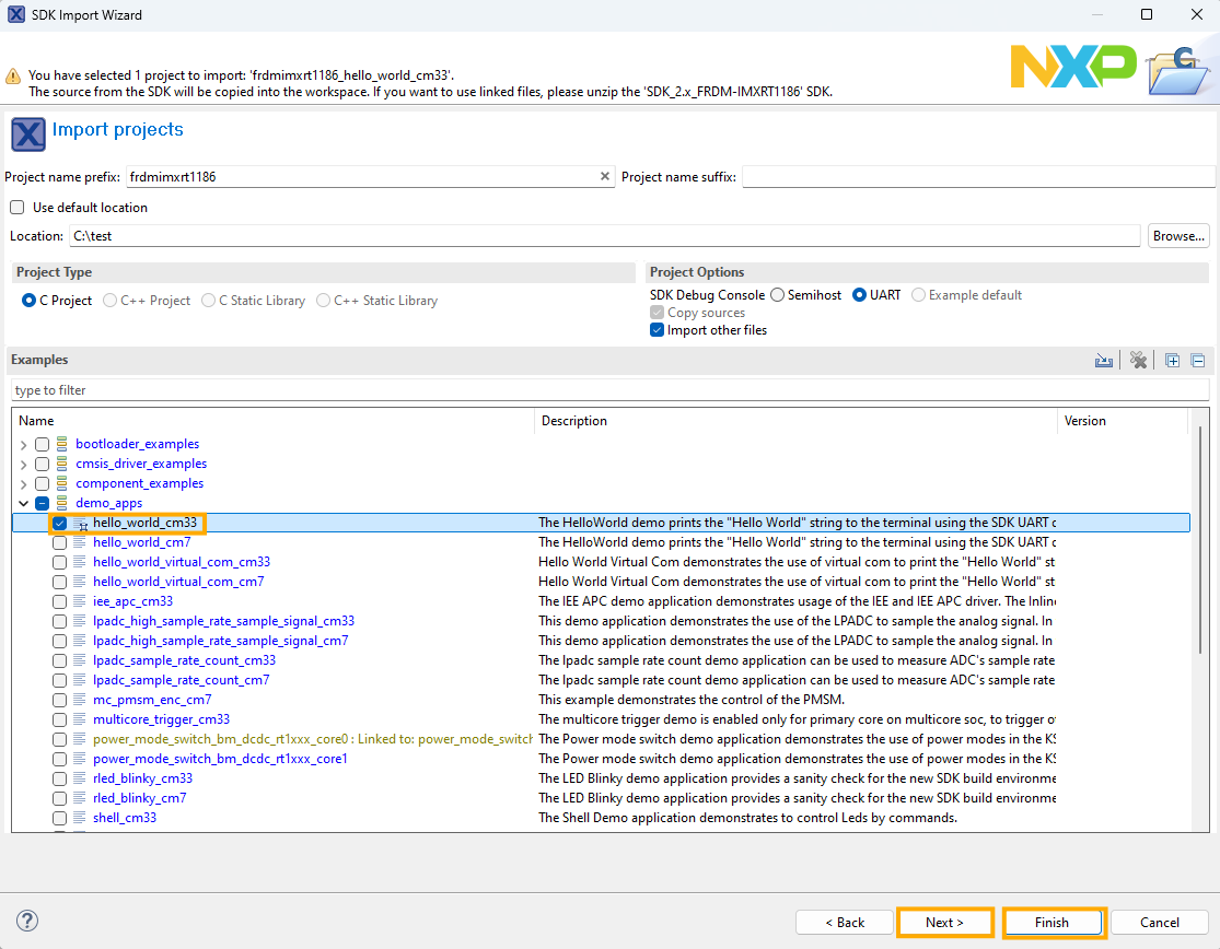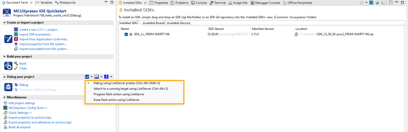 This section describes the steps required to configure MCUXpresso IDE to build, run, and debug example applications. The hello_world demo application targeted for the FRDM-IMXRT1186 hardware platform is used as an example, through these steps can be applied to any example application in the MCUXpresso SDK.