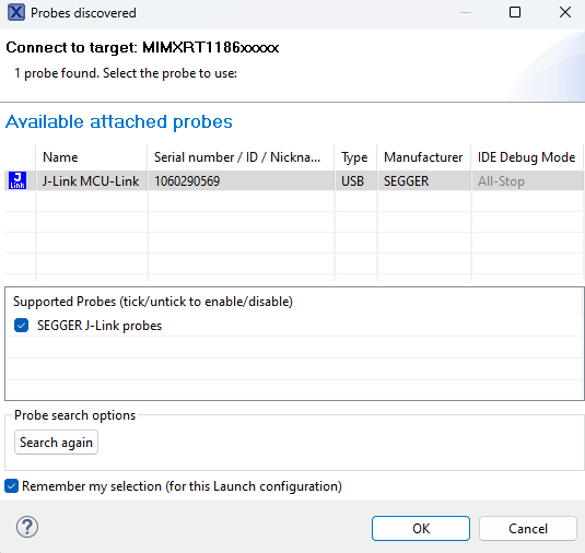 After you click the Debug button, the IDE shows the J-Link probe identified. Click OK to continue the debugging.