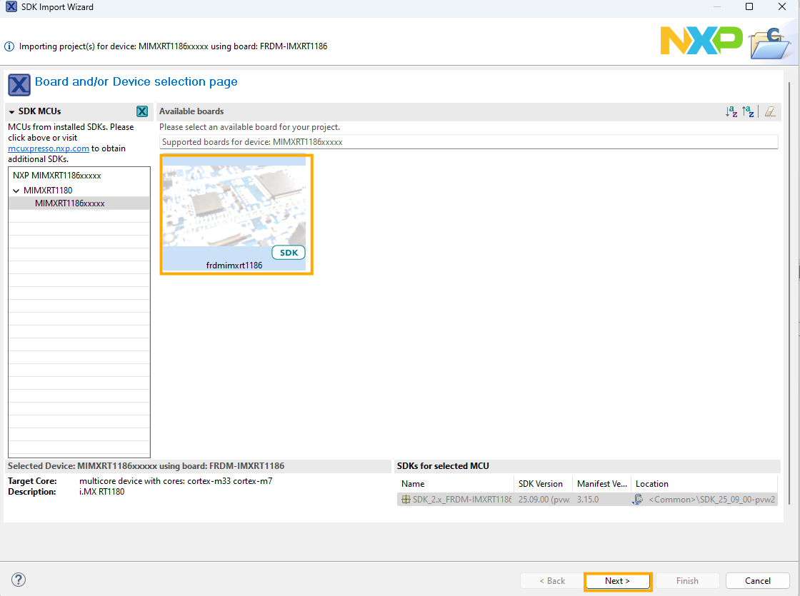 Multicore examples are imported into the workspace in a similar way as single core applications, explained in Build an example application. When the SDK zip package for frdmimxrt1186 is installed and available in the Installed SDKs view, click Import SDK example(s)… on the Quickstart Panel. In the window that appears, select frdmimxrt1186 and click Next.