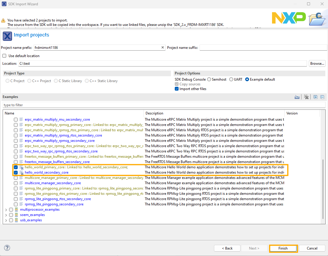 multicore_examplesfolder and select hello_world_primary_core. Thehello_world_secondary_corecounterpart project is automatically imported with thecm33project, because the multicore examples are linked together and there is no need to select it explicitly. Click Finish.