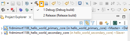 hello_world_primary_coreproject (multicore master project) in the Project Explorer. Then choose the appropriate build target, Debug or Release, by clicking the downward facing arrow next to the hammer icon, as shown in Figure 3. For this example, select Debug.