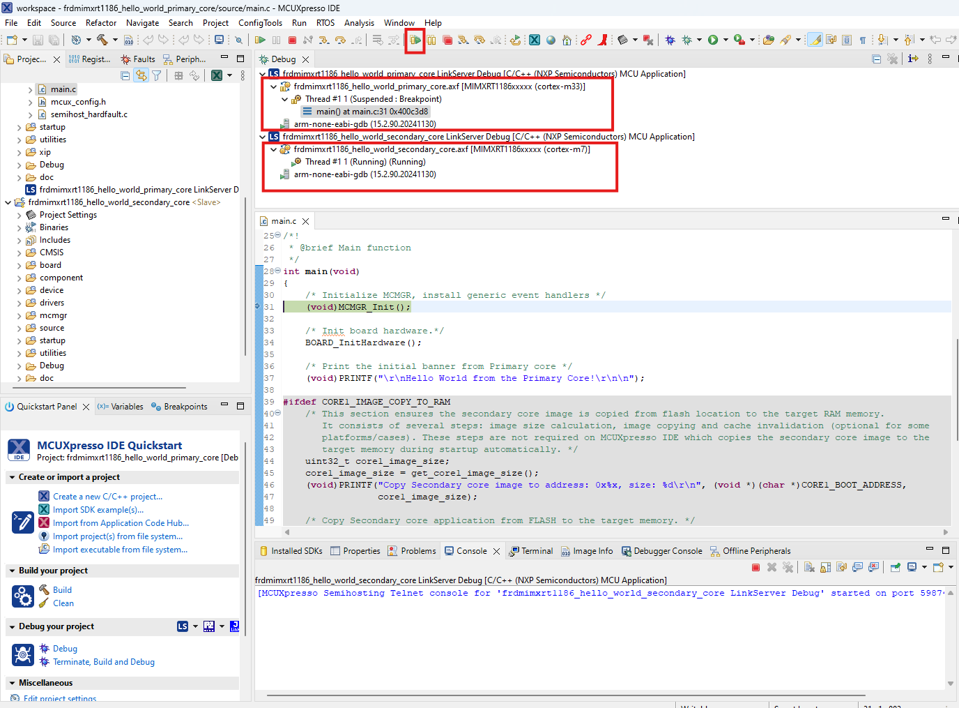 This section describes the steps required to configure MCUXpresso IDE to build, run, and debug multicore example applications. The following steps can be applied to any multicore example application in the MCUXpresso SDK. Here, the dual-core version of hello_world example application targeted for the frdmimxrt1186 hardware platform is used as an example.