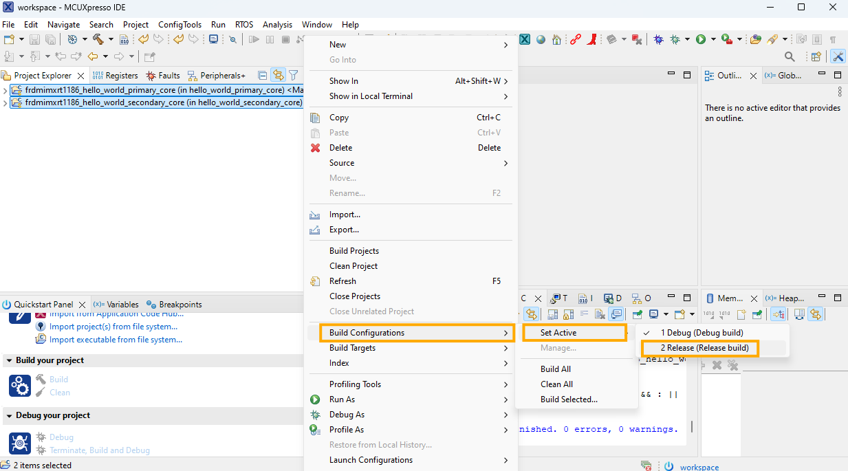 When the Release build is requested, it is necessary to change the build configuration of both the primary and auxiliary core application projects first. To do this, select both projects in the Project Explorer view and then right click which displays the context-sensitive menu. Select Build Configurations -> Set Active -> Release. This alternate navigation using the menu item is Project -> Build Configuration -> Set Active -> Release. After switching to the Release build configuration, the build of the multicore example can be started by triggering the primary core application (cm33) build.