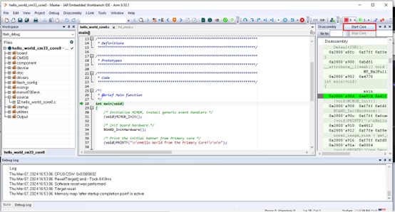 Begin with a simple dual-core version of the Hello World application. The multicore Hello World IAR workspaces are available in the folder: