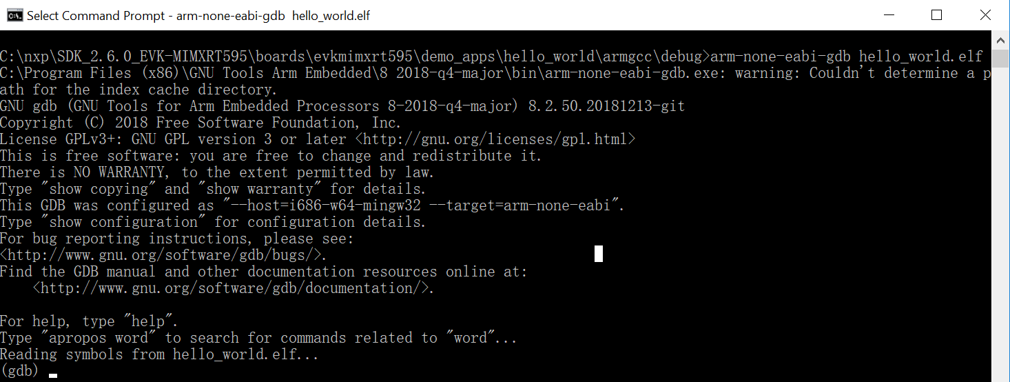 arm-none-eabi-gdb.exe <application_name>.elfcommand. For this example, it isarm-none-eabi-gdb.exe hello_world_cm33_core0.