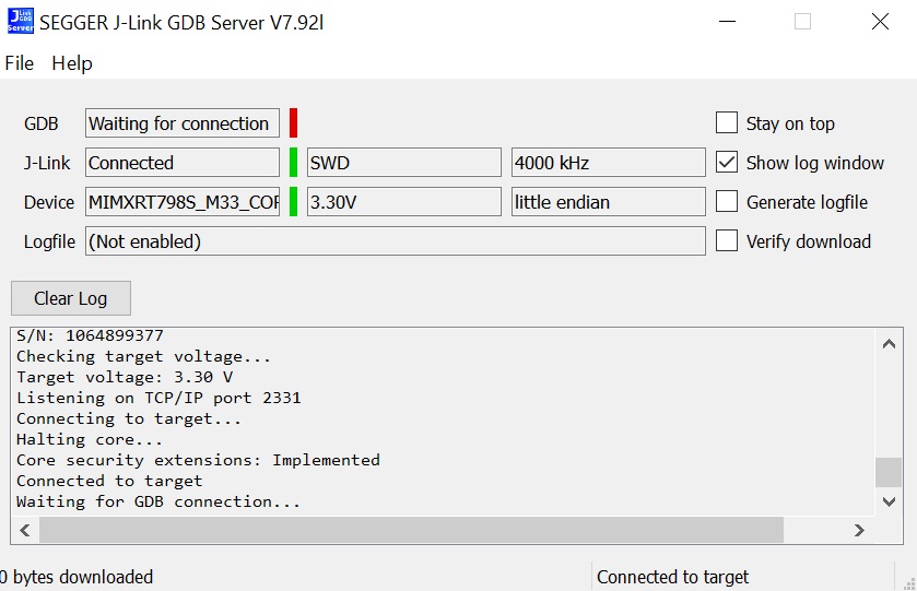 Open the J-Link GDB Server application. Assuming the J-Link software is installed, the application can be launched by going to the Windows operating system Start menu and selecting Programs->SEGGER->J-Link <version> J-Link GDB Server.