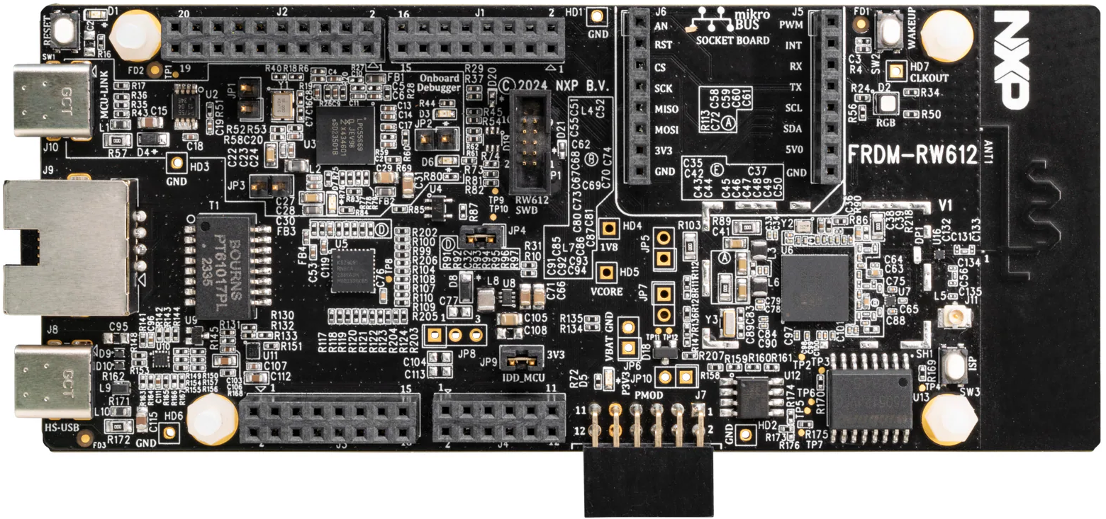 FRDM-RW612 is a compact and scalable development board for rapid prototyping of the RW61x series of Wi-Fi 6 + Bluetooth Low Energy + 802.15.4 tri-radio wireless MCUs. It offers easy access to the MCU’s I/Os and peripherals, integrated open-standard serial interfaces, external flash memory and on-board MCU-Link debugger.