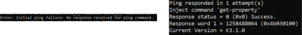 Double click on the KW47-LOC_NBUProgram.cmd script to program the NBU and load the FAT software. This script first executes a command to make sure the KW47 has entered ISP mode properly. If the device did not enter in ISP mode, it cannot be programmed. The following examples show when the device did not enter in ISP (left) and when the device was programmed properly (right).