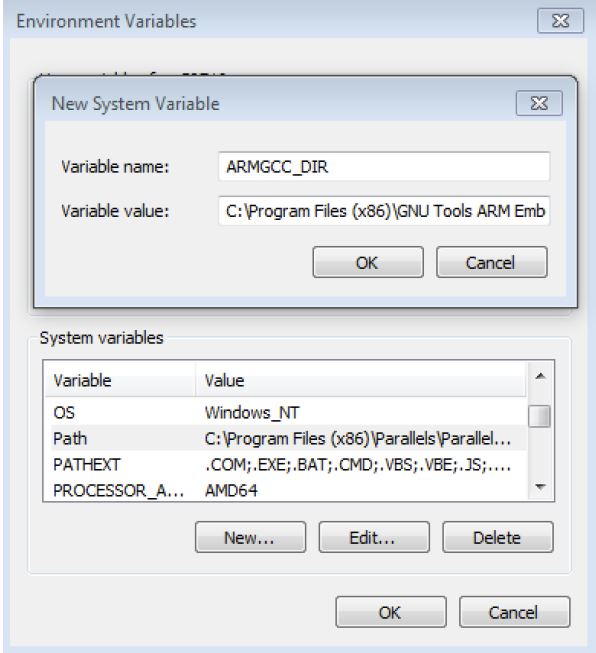 Create a new system environment variable and name it ARMGCC_DIR. The value of this variable should point to the Arm GCC Embedded tool chain installation path.