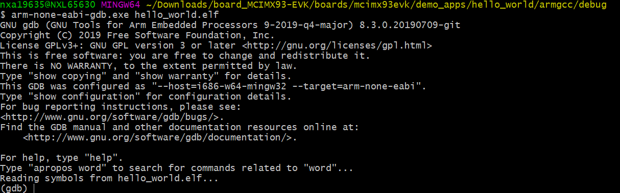 2. Run the command of arm-none-eabi-gdb.exe <application_name>.elf. For this example, it is arm-none-eabi-gdb.exe hello_world.elf.