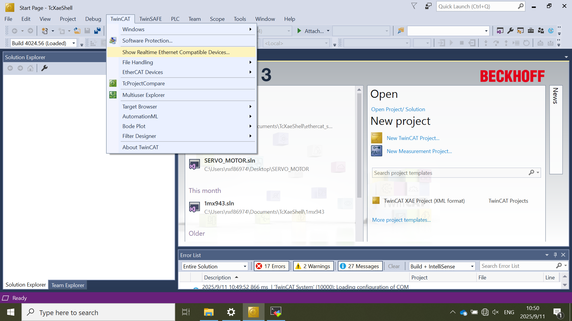 TwinCAT requires the realtime ethernet support. The steps is as below:Click TwinCAT > Show Realtime Ethernet Compatible Devices.