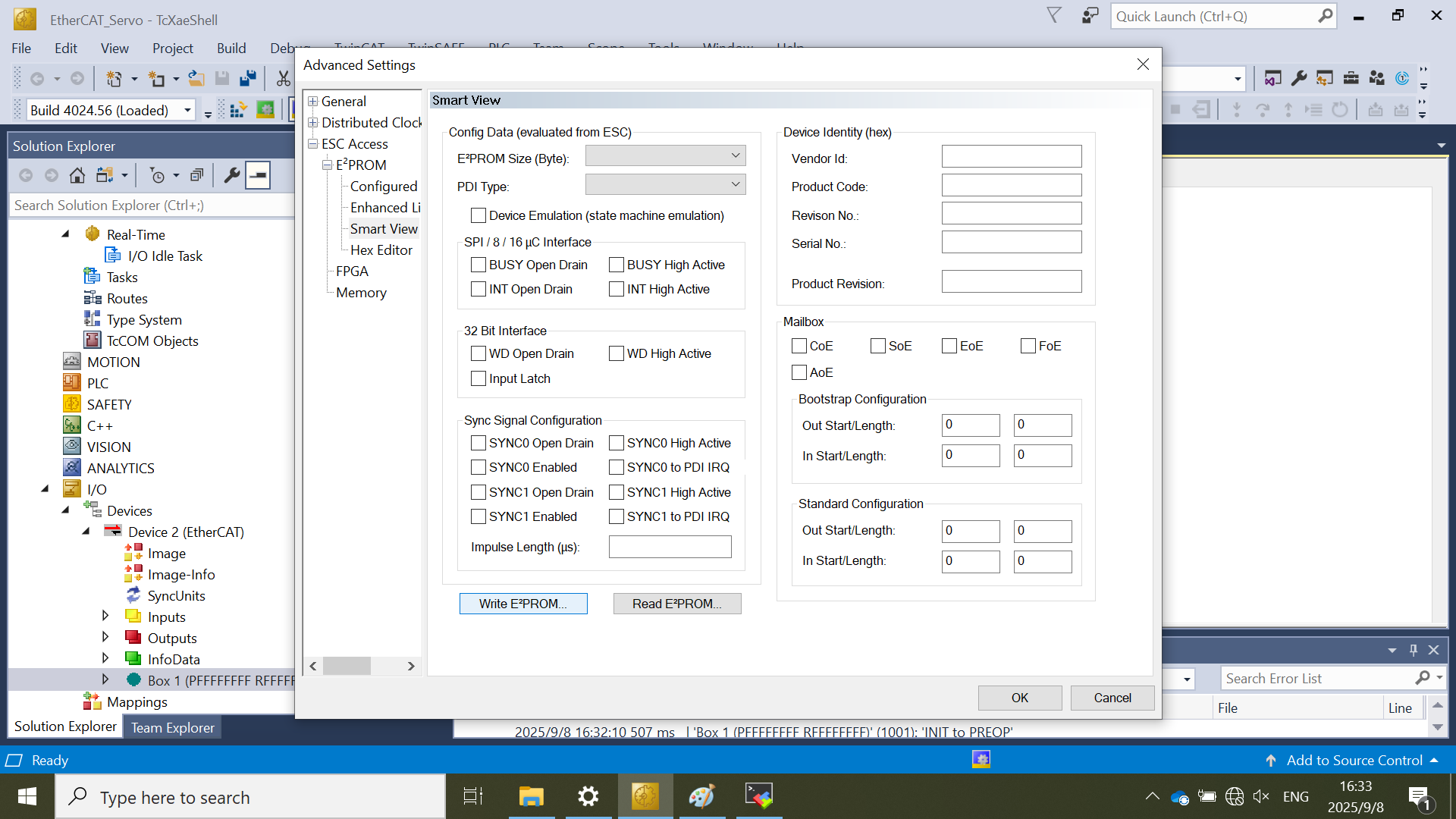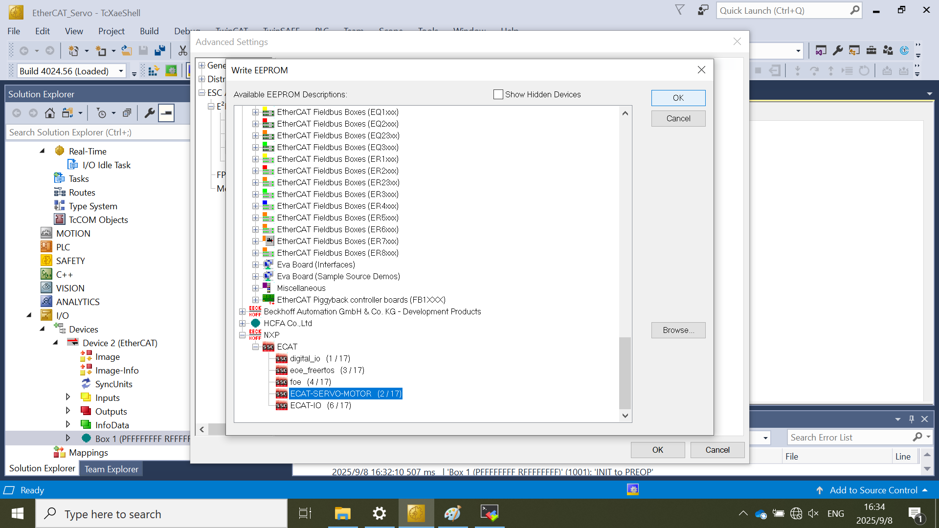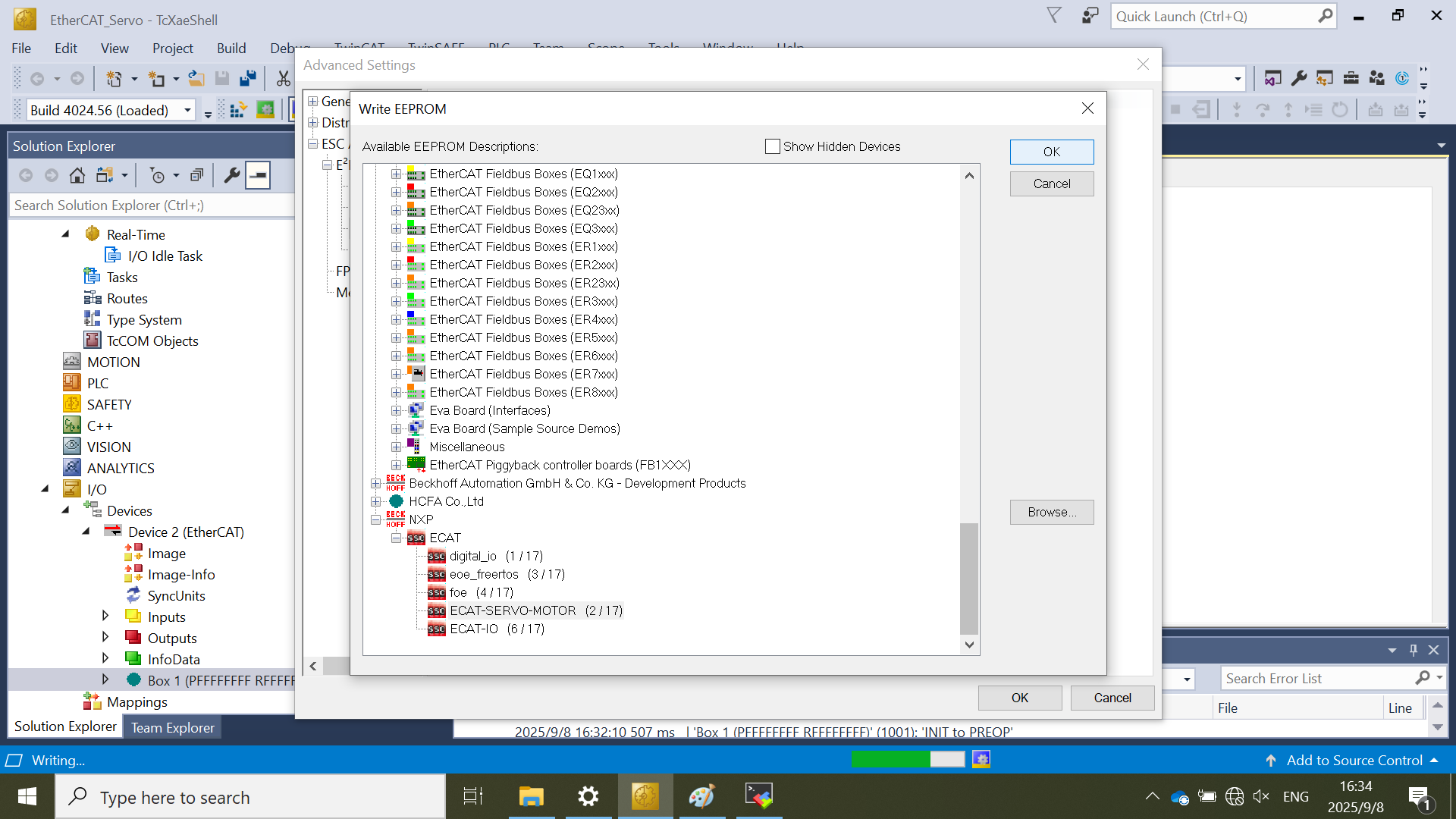 After EEPROM update completion, click Ok to exit. The status of EEPROM writing is shown on the bottom of TwinCAT IDE.