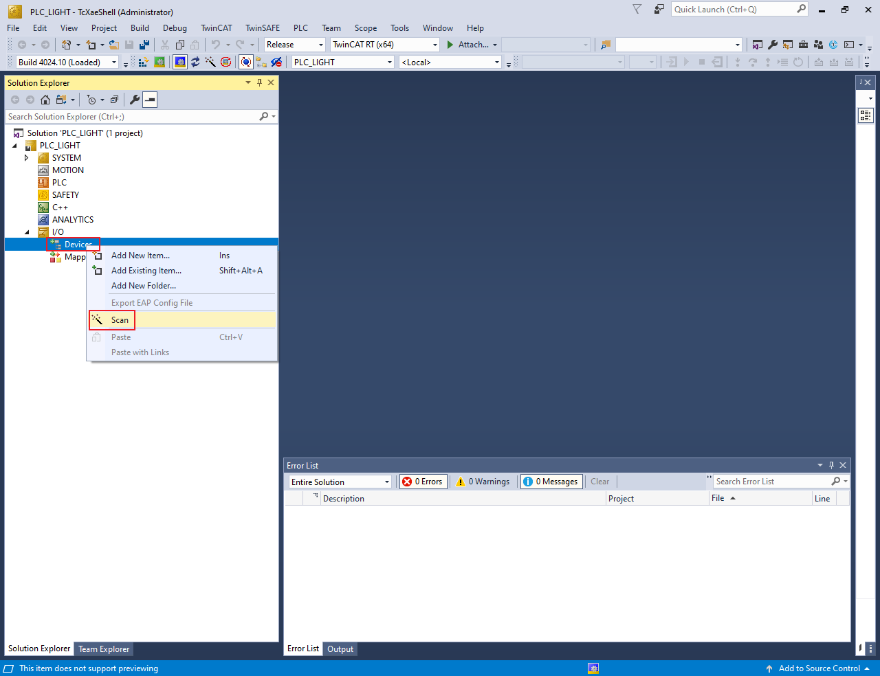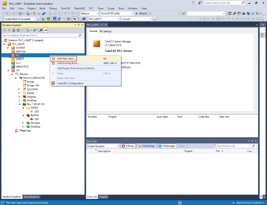 In the Solution Explorer view, right-click on PLC and select Add New Item.