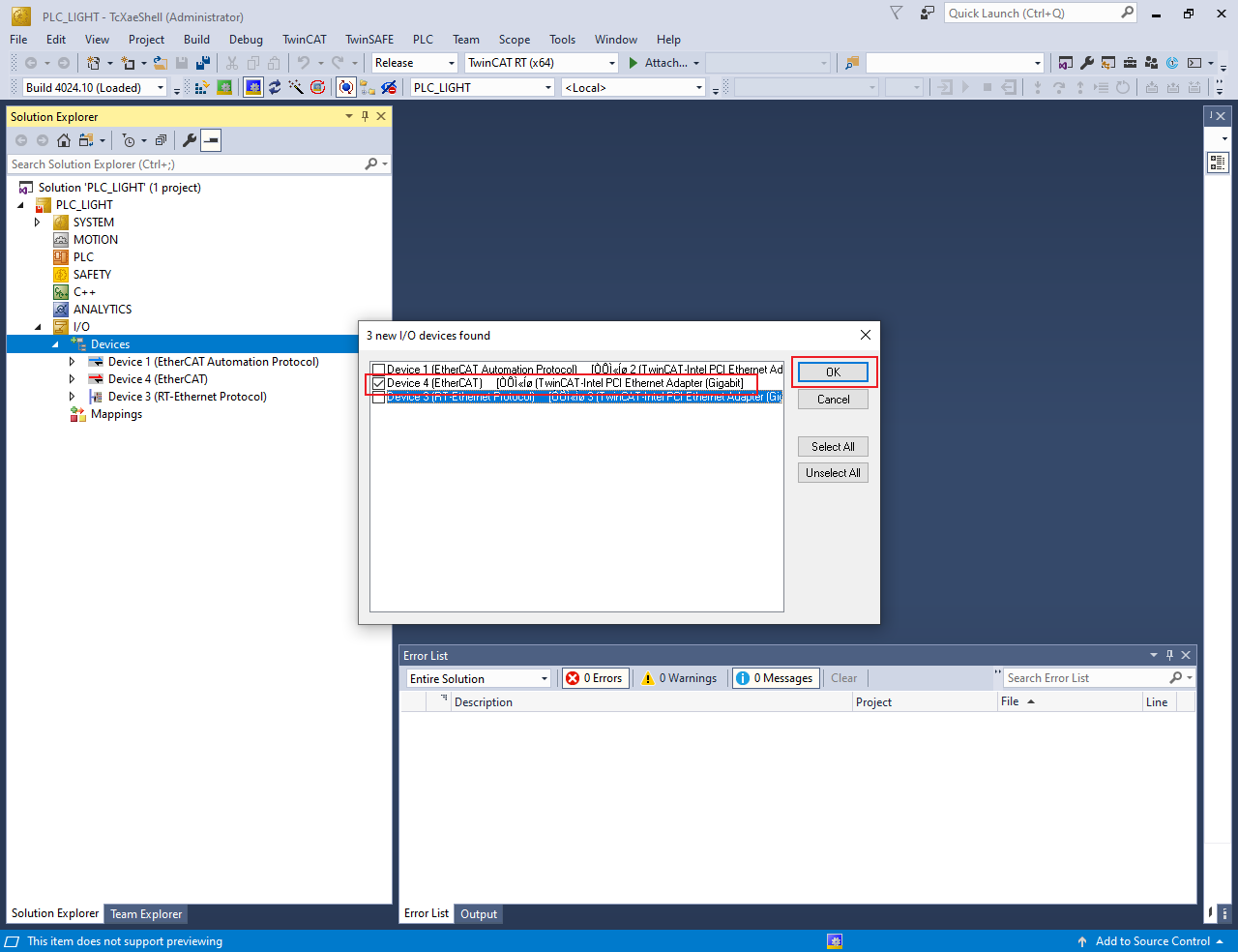 Under Device, double-click the EtherCAT device selected in step 4.The TwinCAT Project dialog box appears.