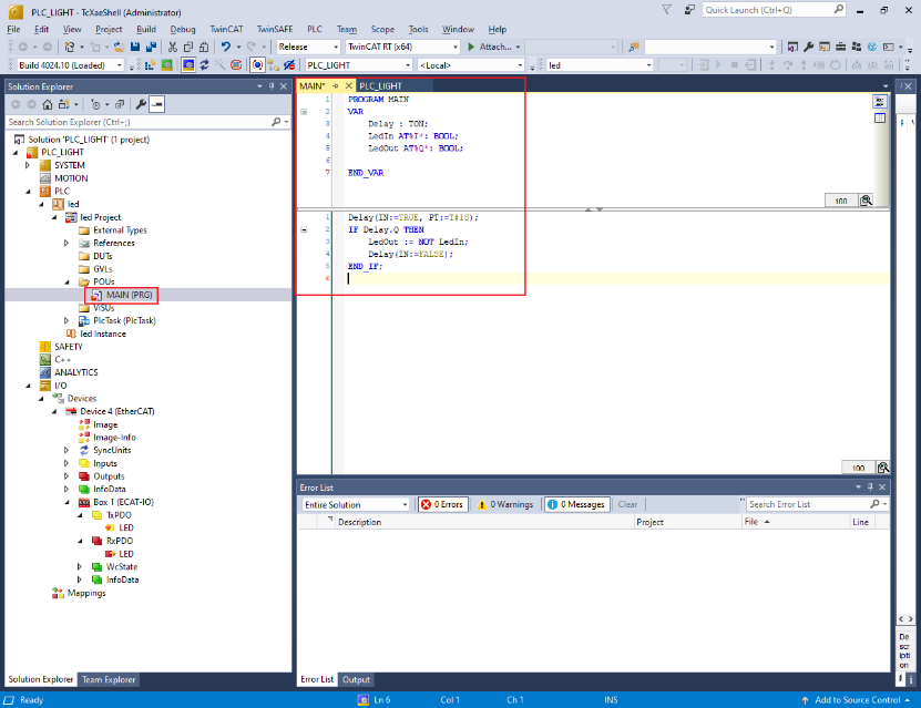 PROGRAM MAIN VAR Delay : TON; LedIn AT %I* : BOOL; LedOut AT %Q* : BOOL; END_VAR