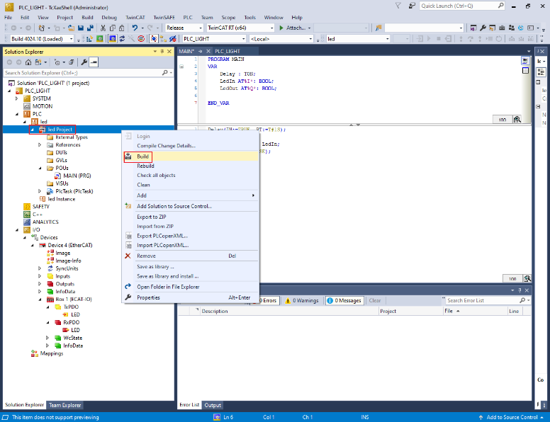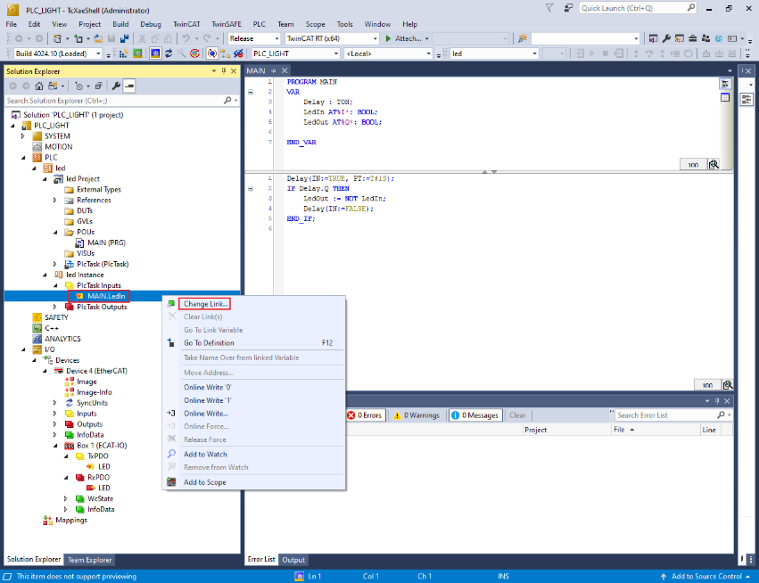 In the Solution Explorer, under PlcTask Outputs, right-click on MAIN.LedOut and select Change Link.