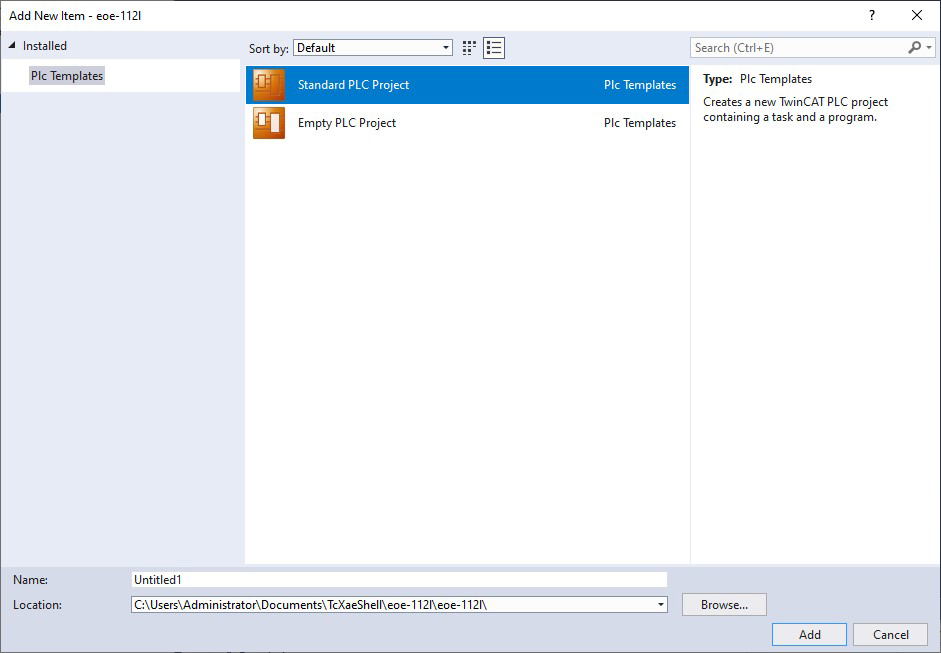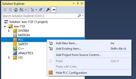 In the Solution Explorer view, right-click on PLC and select Add New Item.