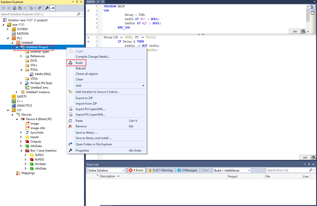 Right-click on the PLC project and select Build.