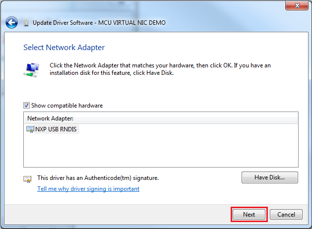 Installing the RNDIS driver for virtual_nic example