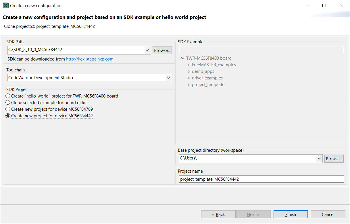 2. Use MCUXpresso Config Tool to create a project_template project as below(take MC56F84442 as example).