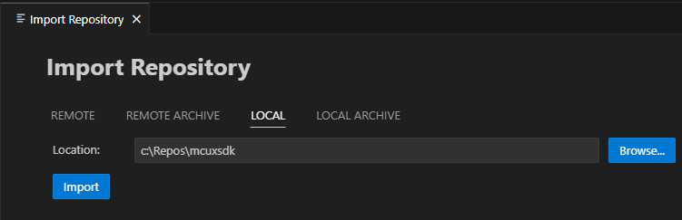 Select Local if you’ve already obtained the SDK as seen in Get MCUXpresso SDK Repo. Select your location and click Import.