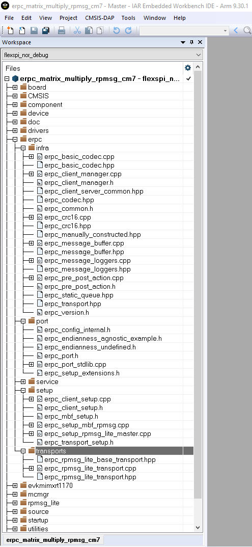 • RPMsg-Lite is used as the transport layer for the communication between cores, erpc_rpmsg_lite_base_transport.hpp, erpc_rpmsg_lite_transport.hpp, and erpc_rpmsg_lite_transport.cpp files needs to be added into the client project.