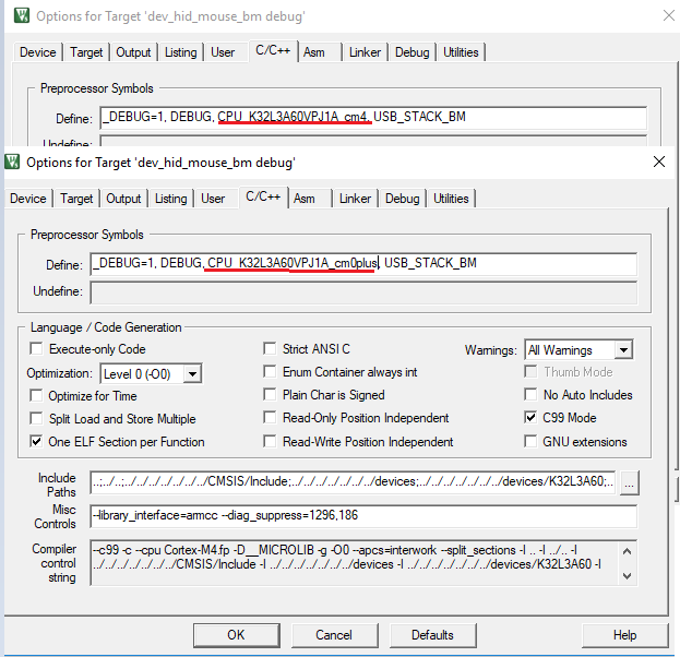 In M4 project in MDK, in option > C/C++ compiler, change the CPU MACRO from “ CPU_K32L3A60VPJ1A_cm4” to “CPU_K32L3A60VPJ1A_cm0plus”.