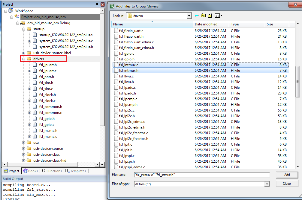 Add int-mux file to M0p project, driver -add Exiting Files to Group ‘driver’, as shown in the image bellow