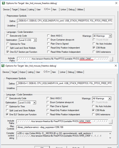 Again in M4 project in MDK, in option–>linker, change the linker configure file form M4 link file to M0p link file. The linker file path is devices\K32L3A60 folder.