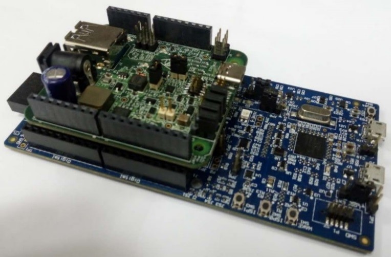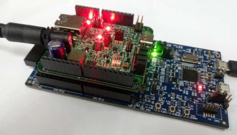 Note: Before powering up, verify the USB Type-C shield is pushed all the way into the Arduino header with good contact. Make sure there are no unintentional shorts (like jumper, blue wires) between the USB Type-C Shield board and the main development board.