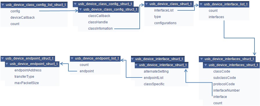 The lists below show user-modifiable variable types for an already implemented class driver. The user should also modify the corresponding MACROs defined in the usb_device_descriptor.h file. See the MCUXpresso SDK API Reference Manual (document MCUXSDKAPIRM) for details.