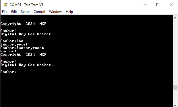 The first step is to run the “factoryreset” command on both boards in order to ensure no previous bonding data is present in non-volatile memory. See Figure 1.